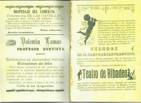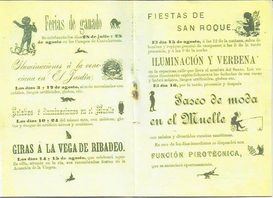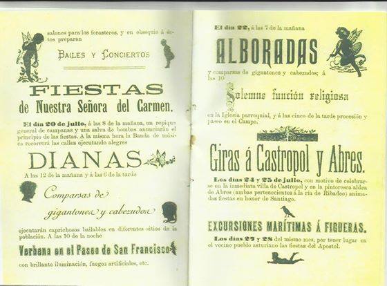 Comienzo con el mas antiguo que tengo, correspondiente al año 1895, con un programa de actividades muy amplio, destacando las «Giras» a las fiestas de Abres, Castropol, Figueras y Vega de Ribadeo, para acudir a las fiestas que celebraban nuestros vecinos; las fiestas en honor a la Virgen del Carmen en el Parque de San Francisco; Paseos de Moda en el muelle; importantes ferias de ganado; tiradas de Pichon; concurso de cintas; veladas musicales en la Ria….